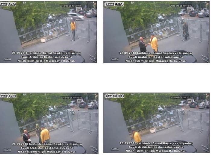 İddianamede, Cemal Kaşıkçı'nın evlilik işlemleri için gerekli belgeyi almak için nişanlısı Hatice Cengiz ile ilk 28 Eylül 2018'de konsolosluğa gittiği ve daha sonra olay tarihi olan 2 Ekim 2018'de gidişine ilişkin kamera görüntüleri iddianamede yer aldı. Ayrıca 1-2 Ekim 2018 tarihlerinde ülkemize özel jet veya tarifeli uçaklarla giriş-çıkış yapan Kağıthane ve Şişli'de bulunan iki otelde konaklayan 15 şüphelinin Atatürk Havalimanı'ndan girişleri, konsolosluğa yakın otellerde konaklamaları, otelden çıkış yaparak konsolosluk binasına, konutuna giriş çıkış yapmaları, daha sonra havalimanından ayrılmalarına ilişkin kamera görüntülerine de iddianamede yer verildi.