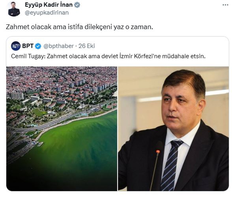 AK Parti Gençlik Kolları Genel Başkanı ve İzmir Milletvekili Eyyüp Kadir İnan, X hesabından Tugay'a yönelik "Zahmet olacak ama istifa dilekçeni yaz o zaman" şeklinde paylaşım yaptı.