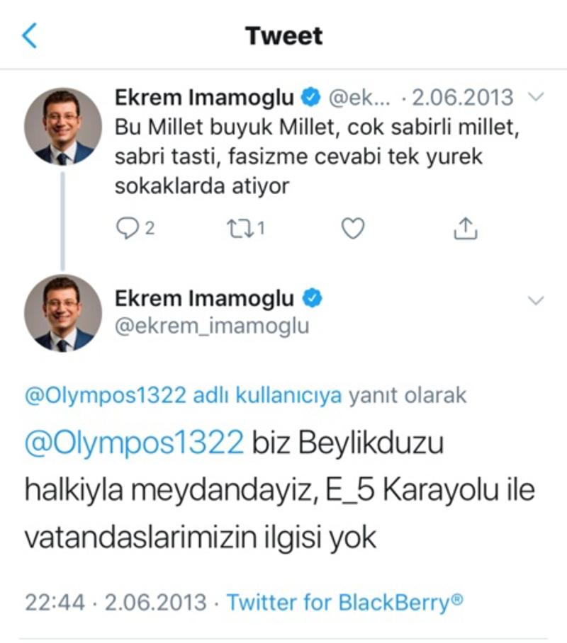 İmamoğlu'nun 1-2 Haziran 2013 tarihli paylaşımları şu şekilde: