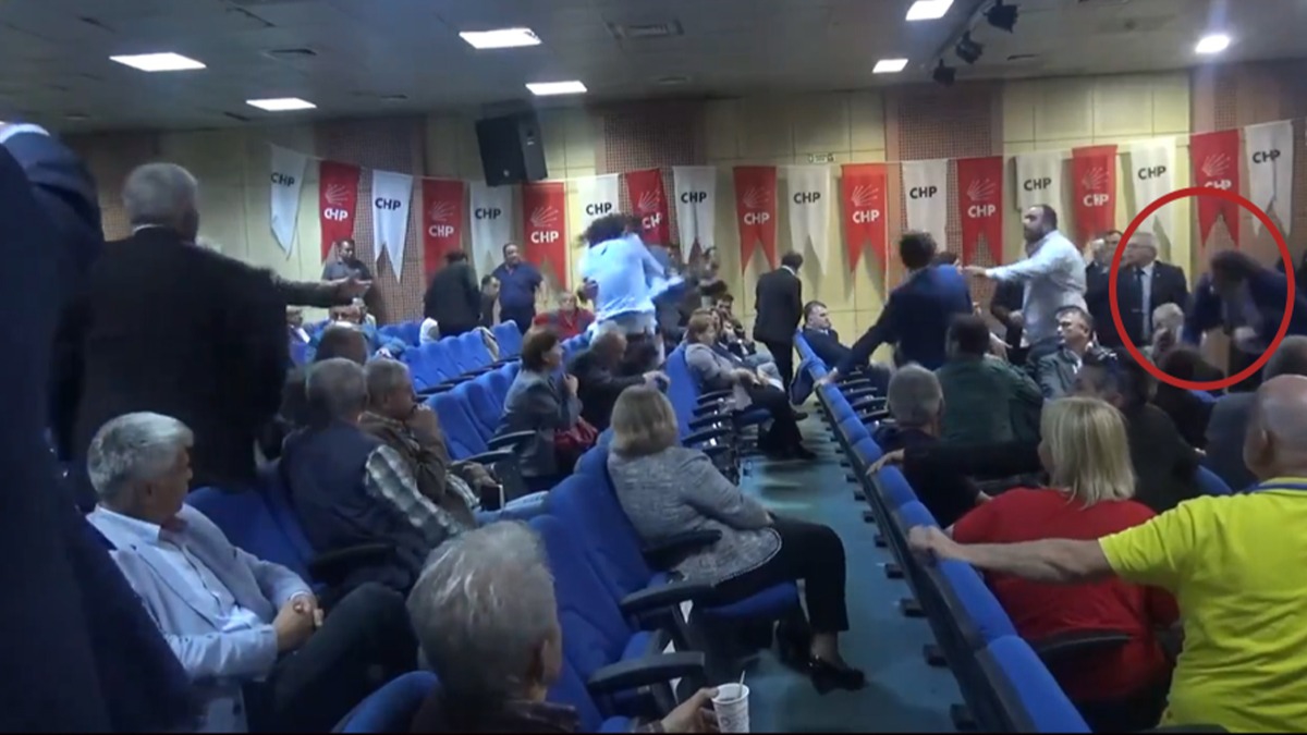CHP'li Rıza Yalçınkaya'nın parti toplantısında kendisine tepki gösteren bir kişiyle önce sözlü tartışmaya girdiği ardından da masadan aldığı cam bardağı sert bir şekilde hedef gözeterek tartışma yaşadığı kişiye attığı görülüyor.