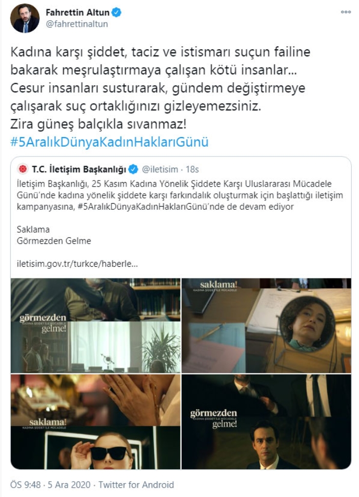 Cumhurbaşkanlığı İletişim Başkanı Fahrettin Altun, "Kadına karşı şiddet, taciz ve istismarı suçun failine bakarak meşrulaştırmaya çalışan kötü insanlar... Cesur insanları susturarak, gündem değiştirmeye çalışarak suç ortaklığınızı gizleyemezsiniz. Zira güneş balçıkla sıvanmaz!" açıklamasında bulundu.