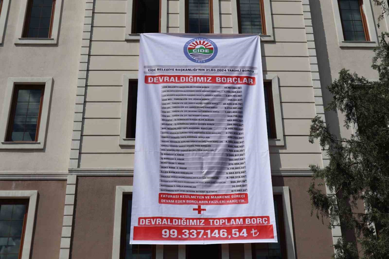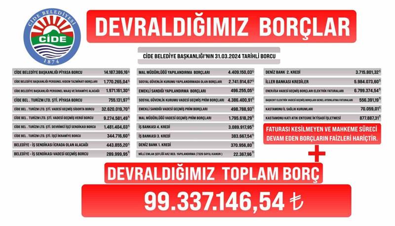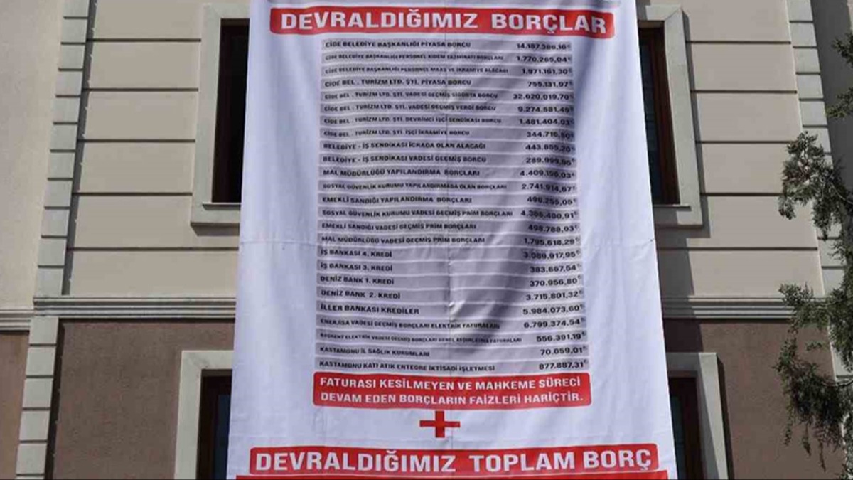 Kastamonu'nun Cide ilçesinde 31 Mart Yerel Seçimleri'nde Cide Belediye Başkanı seçilen MHP adayı Nejdet Demir, CHP'li Belediye Başkanı Mehmet Eşref döneminden kalan belediye borcunu belediye binasına astırdığı dev afişle duyurdu. Asılan afişte Cide Belediyesi'nin hesaplanan borcunun 99 milyon 337 bin 147 TL olduğu belirtildi. Konu ile ilgili açıklama yapan Başkan Demir, "Faturası henüz kesilmeyen ve mahkeme süreci devam eden borçların faizleri bu rakama henüz dahil değildir. Bu rakam önümüzdeki süreçte revize edilecektir" dedi.