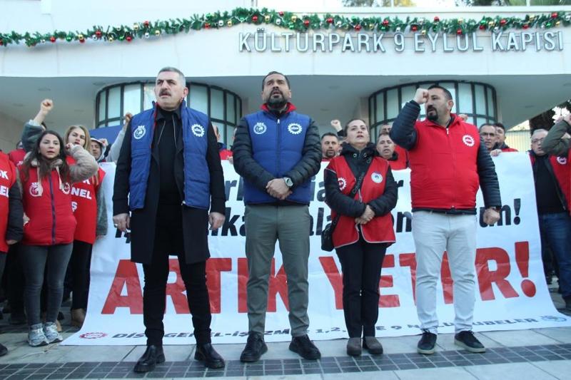 İzmir Büyükşehir Belediyesi'nin iştirakleri İZENERJİ, İZELMAN, İZFAŞ, EGEŞEHİR ve İZTEK'te çalışan işçilerin ödeme krizi ve işten çıkarmalara karşı başlattıkları eylemler 5'inci gününde devam ederken, gözler bugün saat 13.00'te yapılacak kritik görüşmeye çevrildi. Aylardır ödenmeyen haklar, TİS (toplu iş sözleşmesi) ödemelerinin yapılmaması, maaşların eksik yatırılması, işten çıkarılan işçilerin geri alınmaması ve "havuz sistemi" olarak bilinen uygulamadaki sorunlar nedeniyle eylemlerini sürdüren işçiler, bugün de Kültürpark Basmane Kapısı önünde toplanarak basın açıklaması yaptı.