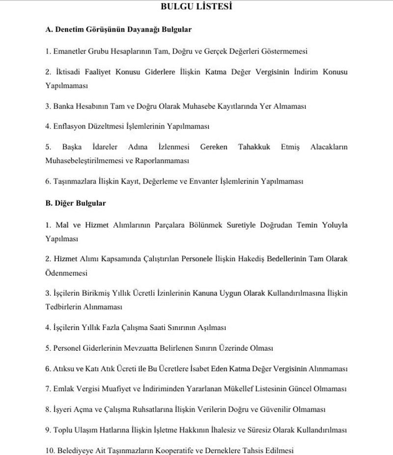 Sayıştay, "Belediyenin hata, hile ve usulsüzlükleri önleme kapasitesi çok düşük. İç kontrol ve ön mali kontrol mekanizmaları işletilmemektedir" ifadelerini kullanarak, üst yönetime acil önlem çağrısı yaptı.