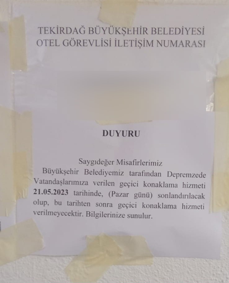 Kararda, Tekirdağ Büyükşehir Belediyesince, 16 Mayıs 2023'te Tekirdağ Valiliği ve Tekirdağ İl AFAD Müdürlüğüne gönderilen yazıda, "Depremzede vatandaşlarımıza yönelik geçici konaklama hizmetimiz, 21 Mayıs 2023'te sonlandırılacak olup AFAD tarafından gerekli işlemlerin yapılması hususunda bilgilerinizi ve gereğini arz/rica ederim." ifadesinin yer aldığı belirtildi.