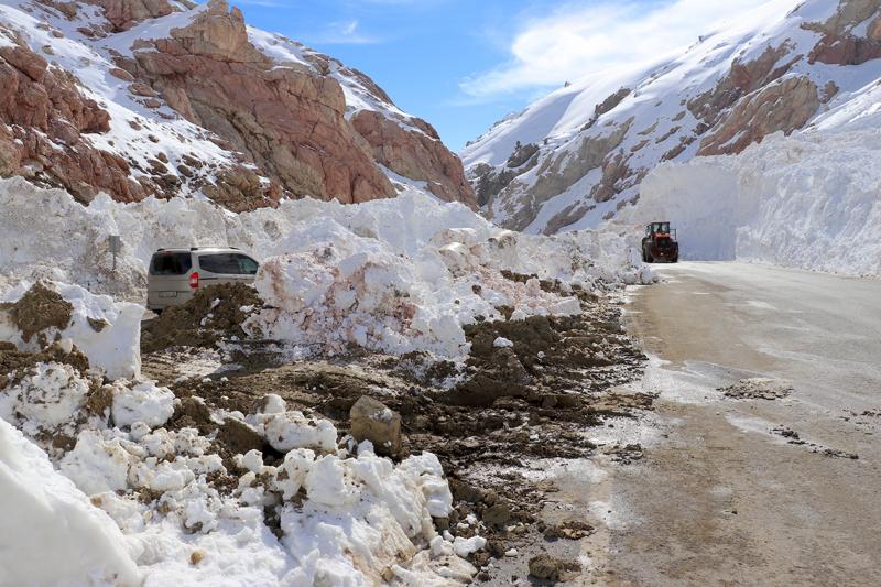 Yer yer 10 metreyi aşan yaklaşık 600 metrelik yolu kardan temizleyen ekipler, karla kaplı diğer 600 metrelik bölümde de çalışarak yolu en kısa sürede ulaşıma açmayı hedefliyor.