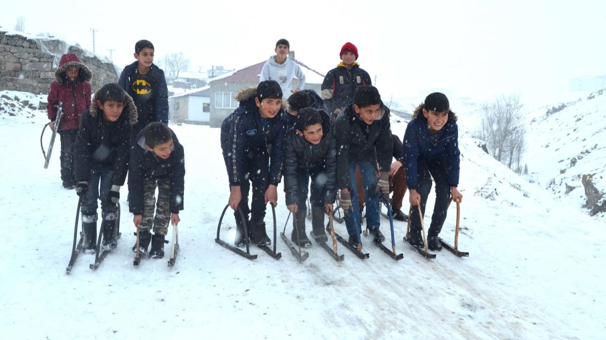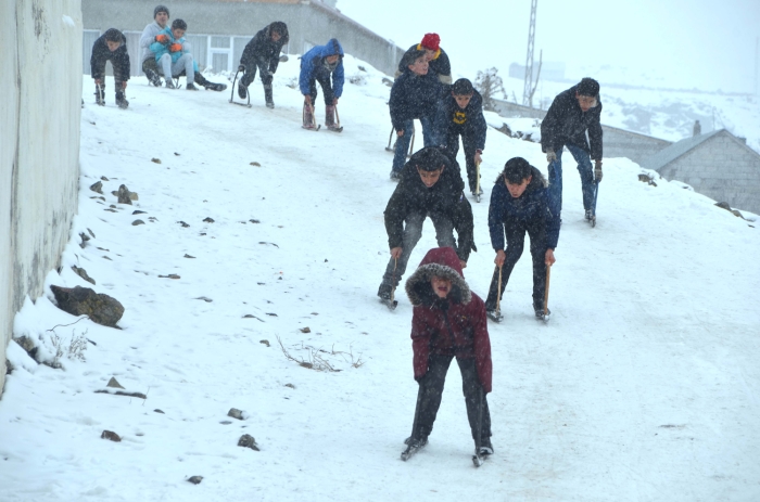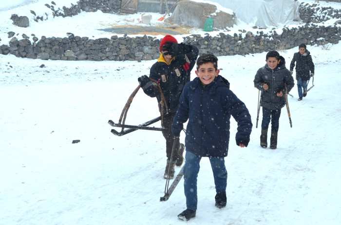 Kar yağışına çok sevindiklerini belirten çocuklar, "Köyümüzün içindeki boş bir alanı pist haline getirdik. Kızaklarımızla kayarak eğleniyoruz. Güzel zaman geçiriyoruz. Kartopu oynuyoruz. Kızaklarımızı demir ve ağaçtan kendimiz yapıyoruz. Öyle güzeller ki kaydığımızda çok mutlu oluyoruz." dedi.