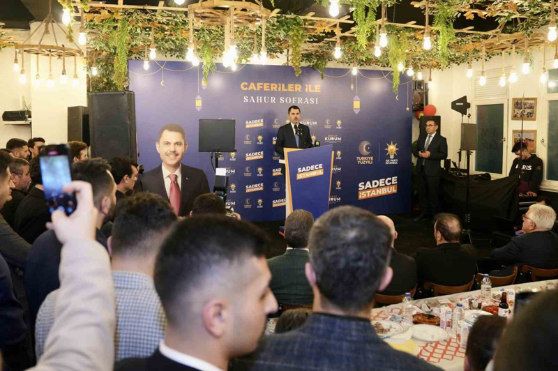 Murat Kurum, 5 yıllık bakanlık döneminde kimseyi ötekileştirmeden milletin taleplerini yerine getirdiğini belirtti. İstanbul'da deprem acısının yaşanmaması için gece gündüz çalışacağını söyleyen Kurum, "Hayalimizi, 'İstanbul Vizyonu' projemizle paylaştık. İstiyoruz ki; İstanbul'da deprem çilesi olmasın. Biz bir deprem şehriyiz, deprem şehrinde depremle mücadele ederek vatandaşımızın canını, malı korunsun. Yaşadığımız şu son bir asırdaki depremlerde 153 bin canımızı kaybettik. Ben o acıları bizzat yaşamış bir kardeşinizim. Oraya gittiğimizde inanın o acıları, o feryatları duyduğumuzda artık her şeyin bittiği an oluyor. Hiçbir şeyin kıymeti yok, hiçbir şeyin önemi yok. Orada hatıralarınız, yakınlarınız kayboluyor. Hani kızınızı gelin edersiniz o evde bir hatıramız vardır değil mi, büyüdüğünüz, çocukluğunuzu yaşadığınız mahallede bir hatıramız vardır. Oradaki ağaç size bir şey anlatır, sokak sizin gençlik yıllarınızda arkadaşlarınızla vakit geçirdiğiniz sokaktır. Oğlumuzu askere göndeririz gururla ama o gün geldiğinde maalesef o hatıraların yok olduğu bir manzarayla karşılaşıyoruz. İstiyoruz ki; bu acılar bir daha yaşanmasın. Yaşanmaması adına da çalışıp çabalayıp İstanbul'u depreme hazır hale getirmemiz lazım. Burada yapılması gereken tek şey, depremle mücadele etmektir. Gerçekten bir milli güvenlik meselesidir, beka sorunudur. Bu sorunu halletmek için de çalışmak gerekir, çabalamak gerekir. Milletiyle el ele verip nasıl asrın felaketinde tüm kardeşlerimiz, 85 milyon depremzede illerimiz için mücadele ettiyse, aynı anlayışla İstanbul'u da ayağa kaldırmak için mücadele etmek durumundayız. Ben 5 yıllık bakanlık görevinde, 9 yıllık genel müdürlük görevimde bu anlayışla çalıştım. Kimseyi ötekileştirmeden, kimseyi ayrıştırmadan milletimizin bizden beklentisi neyse o beklentiyi gerçekleştirebilmek için gece gündüz mücadele ettim. Buradaki liyakatli kadrolarla yaptık" ifadelerini kullandı.