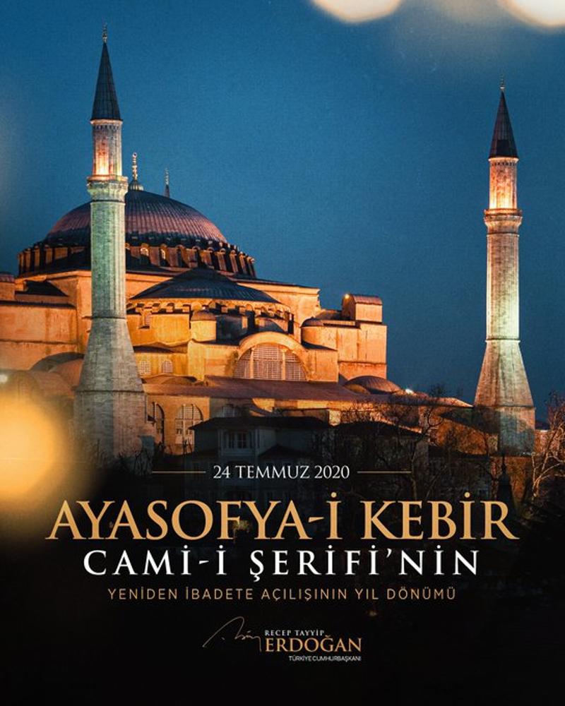 Cumhurbaşkanı Erdoğan, sosyal medya hesabından yaptığı paylaşımda, "İstanbul'un Fethi'nin sembolü, Fatih'in emaneti Ayasofya, 86 yıl aradan sonra ilk ezana ve ilk namaza 5 yıl önce bugün kavuştu... Ayasofya'nın dirilişini görmeyi bizlere nasip eden Rabbime sonsuz şükürler olsun." ifadelerini kullandı.