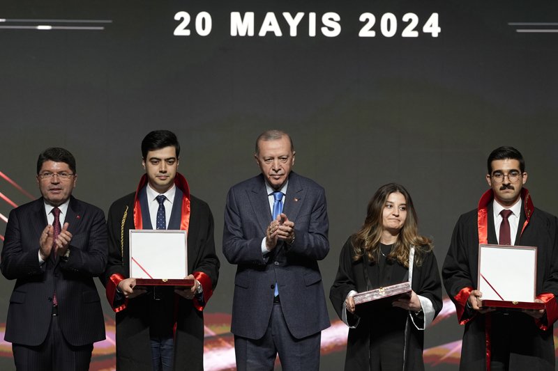 Mesleğe kabul edilen ve kura töreniyle görev yerleri belli olacak hakim ve savcılara başarılar dileyen Cumhurbaşkanı Erdoğan, "Buradaki her bir genç arkadaşımın meslek hayatı boyunca üzerindeki cübbenin, vatandaşın adalete ve hukuk devletine olan itimadını temsil ettiğinin şuuruyla hareket edeceğine yürekten inanıyorum. Ülkemize ve milletimize yapacağınız hizmetlerden dolayı şimdiden sizlere teşekkür ediyorum." sözlerini sarf etti.