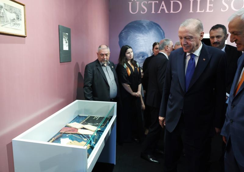 Kısakürek'in sergide izlenime sunulan kişisel eşyasını inceleyen Cumhurbaşkanı Erdoğan, Kısakürek'in oğlu Osman Kısakürek'ten bilgi aldı.