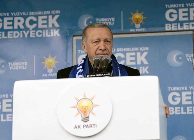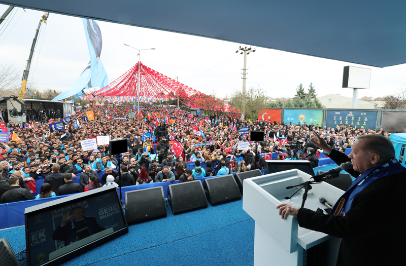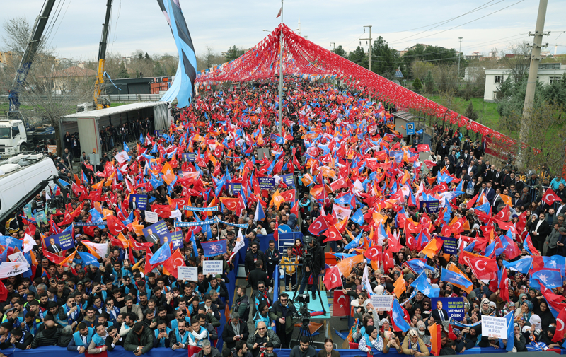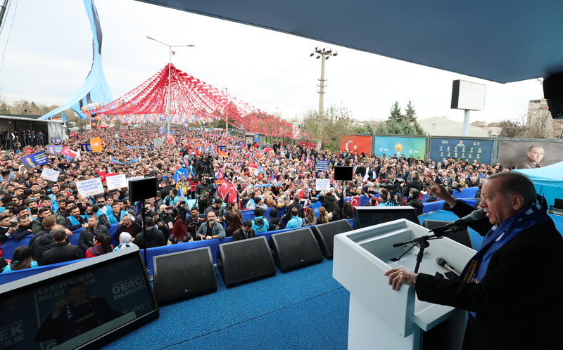Cumhurbaşkanı Erdoğan'ın, "Diyarbakır, 31 Mart'ta Türkiye Yüzyılı şehirleri için hazır mıyız, kararlı mıyız? 31 Mart'ta gerçek belediyeciliği tercih ediyor muyuz? Bunun için seçim gününe kadar kapı kapı dolaşmaya var mıyız? Diyarbakır'la birlikte Türkiye haritasının tamamını Cumhur İttifakı'nın renkleriyle boyamaya var mıyız? Ramazan Bayramı gelmeden, 31 Mart'ta milli irade bayramını birlikte kutlamaya var mıyız?" sorularına, alandakiler hep bir ağızdan "evet" karşılığını verdi.