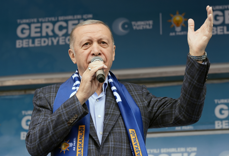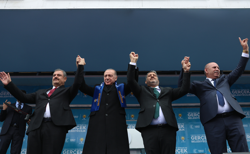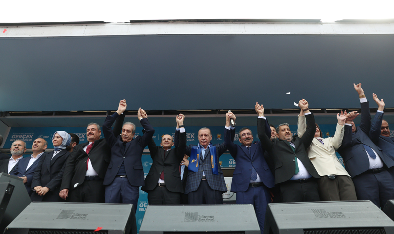 Cumhurbaşkanı Erdoğan, bavul bavul paraların gidip geldiği, meclis üyeliklerinin, belediye şirketlerinin paylaşıldığı bir yerde, ilkeli bir ittifaktan söz edilemeyeceğinin altını çizerek, "Evet, tek sermayesi sizlerin oyları olan DEM, benim Kürt kardeşlerimin iradesini işporta pazarına çıkarmıştır. Dikkat ederseniz, bu pazarlıkta siyasi kazanım hesabı yok, eser ve hizmet derdi zaten yok. Seçmenin fikrini, zikrini, ne düşündüğünü merak eden kimse de yok. Sadece birilerinin ihtirasları uğruna yapılan kirli pazarlıklar var." dedi.