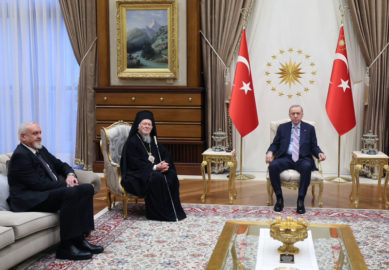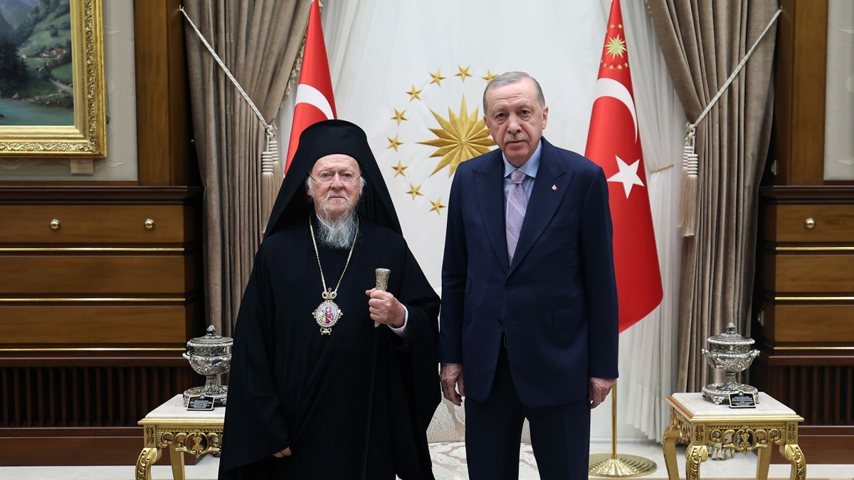Cumhurbaşkanlığı'nın sosyal medya hesabından yapılan açıklamada, "Cumhurbaşkanımız Recep Tayyip Erdoğan, Fener Rum Patriği Bartholomeos'u Cumhurbaşkanlığı Külliyesi'nde kabul etti" denildi.