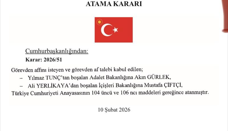 Buna göre, görevden affını isteyen ve görevden af talebi kabul edilen Yılmaz Tunç'tan boşalan Adalet Bakanlığına İstanbul Cumhuriyet Başsavcısı Akın Gürlek, Ali Yerlikaya'dan boşalan İçişleri Bakanlığına Erzurum Valisi Mustafa Çiftçi getirildi.