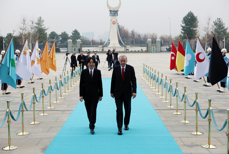 Cumhurbaşkanı Erdoğan, Akishino'yu Cumhurbaşkanlığı Külliyesi'ne gelişinde giriş kapısında karşıladı.