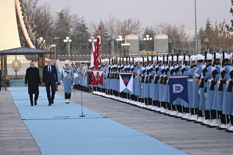 Cumhurbaşkanı Erdoğan ve Mikati'nin tören alanındaki yerlerini almalarının ardından, 21 pare top atışı eşliğinde iki ülkenin milli marşları çalındı. Mikati, Muhafız Alayı Tören Kıtası'nı 'Merhaba Asker' diyerek selamladı. Törende, tarihte kurulan 16 Türk devletini temsil eden bayraklar ve askerler de yer aldı.
