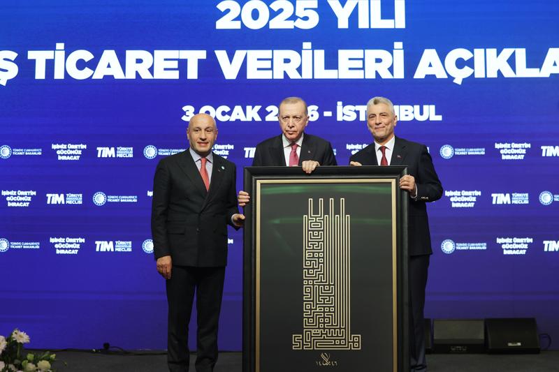 Dış ticaret rakamlarına değinen Erdoğan, "Dış ticaret rakamlarımızın objektif analizini yaparken şu noktanın göz ardı edilmemesi gerektiği kanaatindeyim. 2025 yılı küresel ticarette belirsizliklerin tırmandığı ve korumacılığın belirgin biçimde yükseldiği bir dönem olmuştur. Zayıf dış talep, yakın coğrafyamızda süre gelen savaşlar, iç karışıklıklar ve jeopolitik gerilimlere, tarife artışlarının yol açtığı sorunlar eklenmiştir. Türkiye tüm bunlara ilave olarak dolaylı maliyeti 150 milyar doları bulan 6 Şubat depremlerinin etkileriyle de mücadele etmiştir. Şunu burada büyük bir gururla söylemek isterim, dünyada pek az ülkenin altından kalkabileceği bu sınamaların üstesinden alnımızın akıyla geldik." diye konuştu.