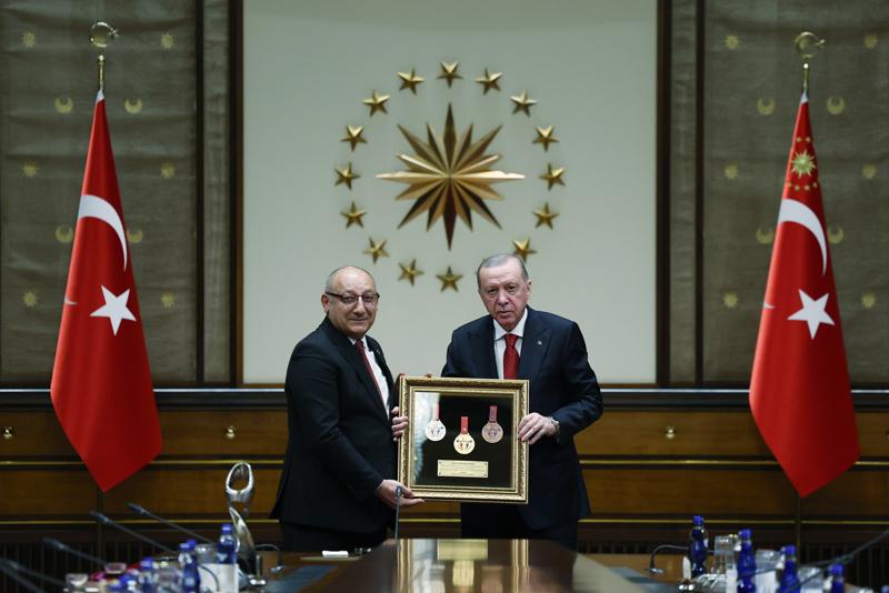 Türkiye Halter Federasyonu Başkanı Talat Ünlü ve Türkiye Tekvando Federasyonu Başkanı Bahri Tanrıkulu, Cumhurbaşkanı Erdoğan'a hediye takdim etti.