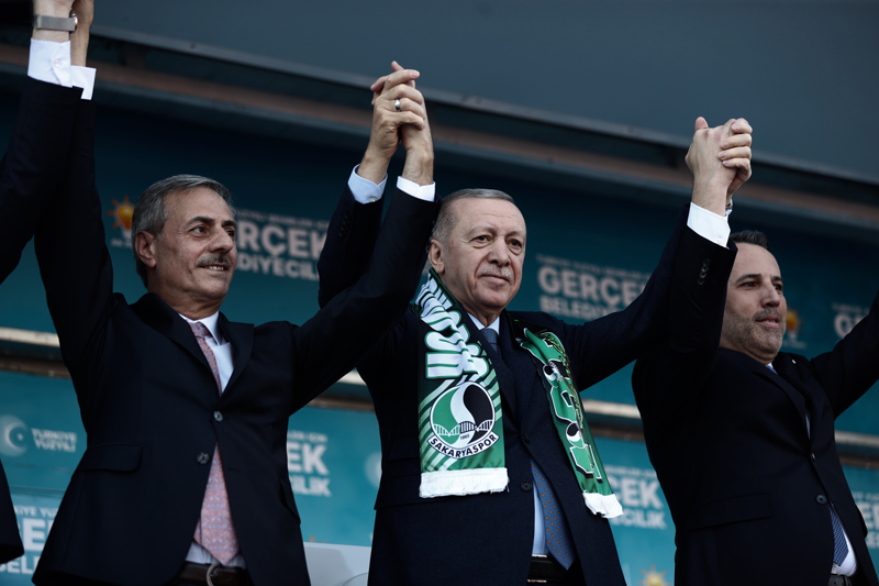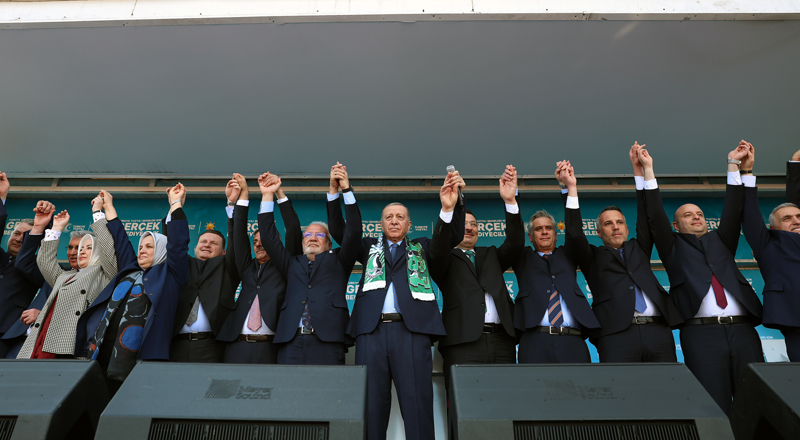 Katılımcılara, "Sakarya'dan öyle bir ses verin ki Marmara'dan Karadeniz'e kadar duymayan kalmasın" diyen Erdoğan'ın, "Ayağa kalkmaya hazır mıyız Sakarya? Sakarya, 31 Mart'ta Türkiye Yüzyılı şehirleri için hazır mıyız? 31 Mart'ta Türkiye Yüzyılı şehirleri için kararlı mıyız? 31 Mart'ta gerçek belediyeciliği tercih ediyor muyuz? Bunun için seçim gününe kadar ana kademe, kadın kolları, gençler kapı kapı dolaşmaya var mıyız? Seçim akşamı Sakarya'yla birlikte Türkiye haritasını Cumhur İttifakı'nın renkleriyle boyamaya var mıyız?" sözlerine alandakiler "Evet" diye karşılık verdi.