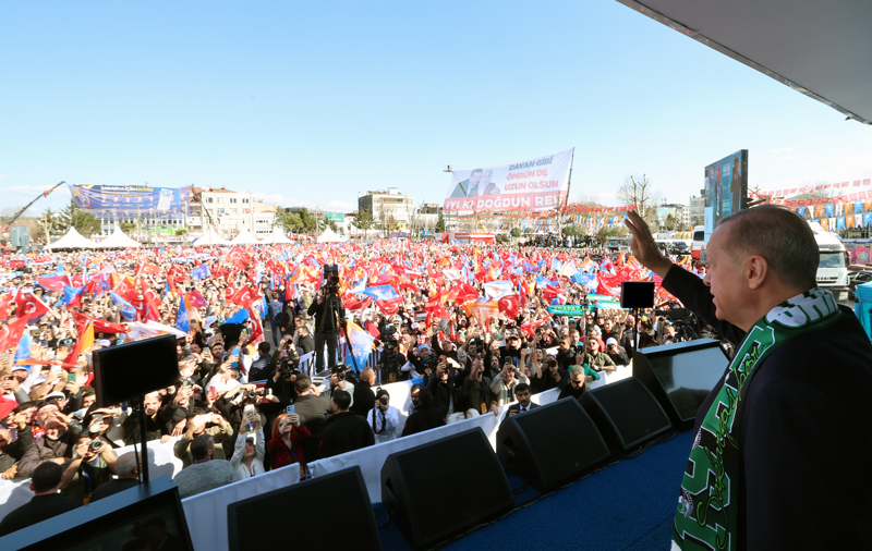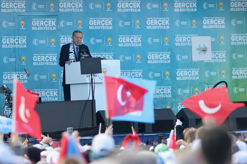 Cumhurbaşkanı Erdoğan, "Sakarya buna hazır mıyız?" sorusuna mitingdekilerin "Evet" diyerek cevap vermesi üzerine, "Milletimizden 31 Mart'ta sandıkta desteği, muhalefetin yaptığı gibi siyasi rant paylaşımı değil, işte bu vizyonu hayata geçirme iradesiyle talip ediyoruz. Bugün sizlerin karşısına da aynı hissiyatla çıktık." ifadelerini kullandı.