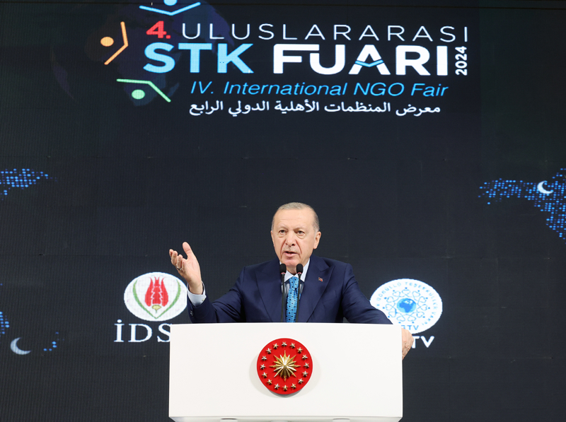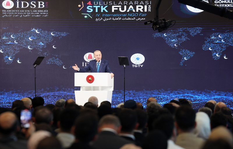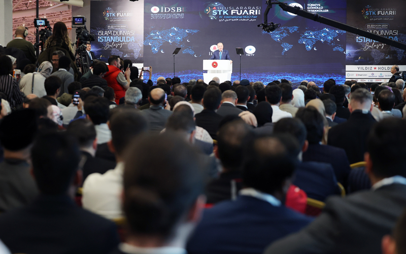 İslam Dünyası Sivil Toplum Kuruluşları Birliği (İDSB) ile Türkiye Gönüllü Teşekküller Vakfı (TGTV) tarafından Atatürk Havalimanı'nda düzenlenen 4. Uluslararası STK Fuarı'nda konuşan Cumhurbaşkanı Erdoğan, kıtaların yanında gönülleri, kültürleri, medeniyetleri birleştiren dünyanın incisi İstanbul'da katılımcılarla bir arada olmaktan memnuniyet duyduğunu dile getirdi.
