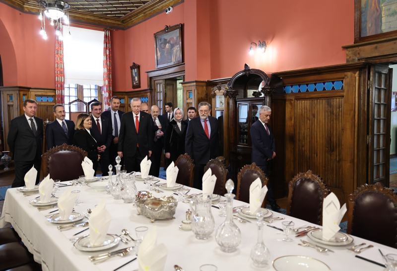Cumhurbaşkanı Erdoğan, Atatürk Müze Köşkü'nde, tarihçi ve yazar Murat Bardakçı ve öteki ilgililer tarafından karşılandı.