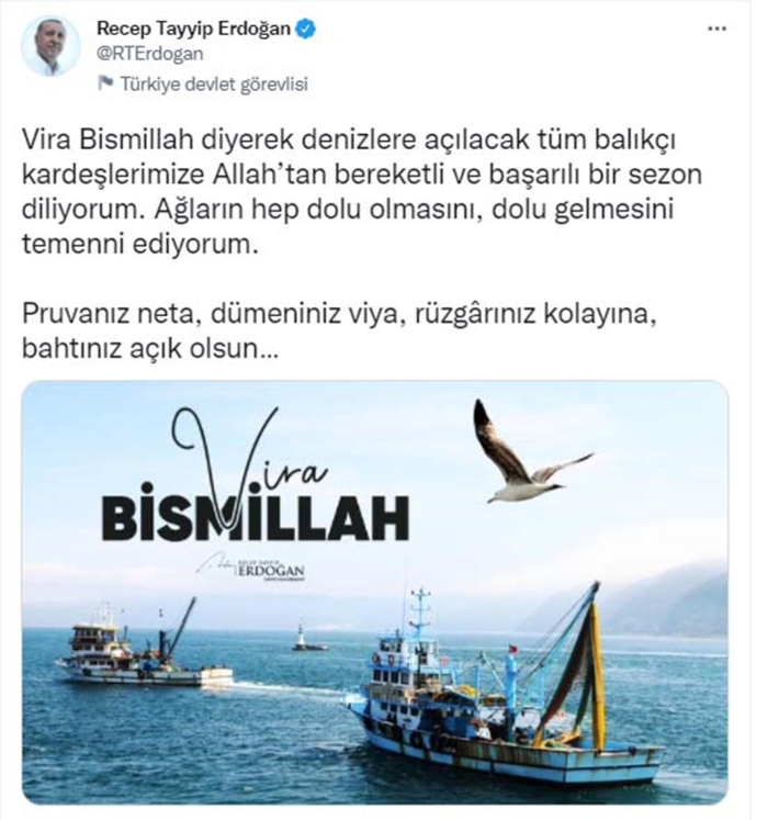Erdoğan, sosyal medya hesabından yaptığı açıklamada, "Vira bismillah diyerek denizlere açılacak tüm balıkçı kardeşlerimize Allah'tan bereketli ve başarılı bir sezon diliyorum. Ağların hep dolu olmasını, dolu gelmesini temenni ediyorum. Pruvanız neta, dümeniniz viya, rüzgarınız kolayına, bahtınız açık olsun." ifadelerine yer verdi.