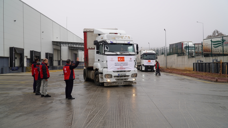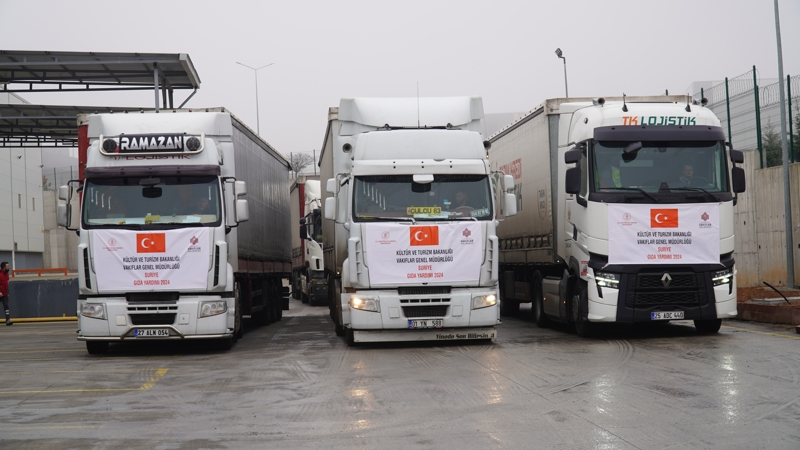 Kültür ve Turizm Bakanlığı Vakıflar Genel Müdürlüğü, Suriye'deki son gelişmelere bağlı olarak ortaya çıkabilecek insani ihtiyaçlar için 75 bin gıda kolisi hazırladı. Şeker, salça, ayçiçek yağı, makarna, bakliyat ürünleri, kuru meyve çeşitleri, gofret ve çikolata bulunan koliler, Afet ve Acil Durum Yönetimi Başkanlığı'na ait TIR'lara yüklendi. Ankara'dan yola çıkan yardım kolilerini taşıyan TIR'lar önce Kilis'e, oradan da Suriye'ye gidecek. Yardım kolileri, Suriye'de 300 bin ihtiyaç sahiplerine ulaştırılacak. Sevkiyat, 31 Aralık'a kadar devam edecek.