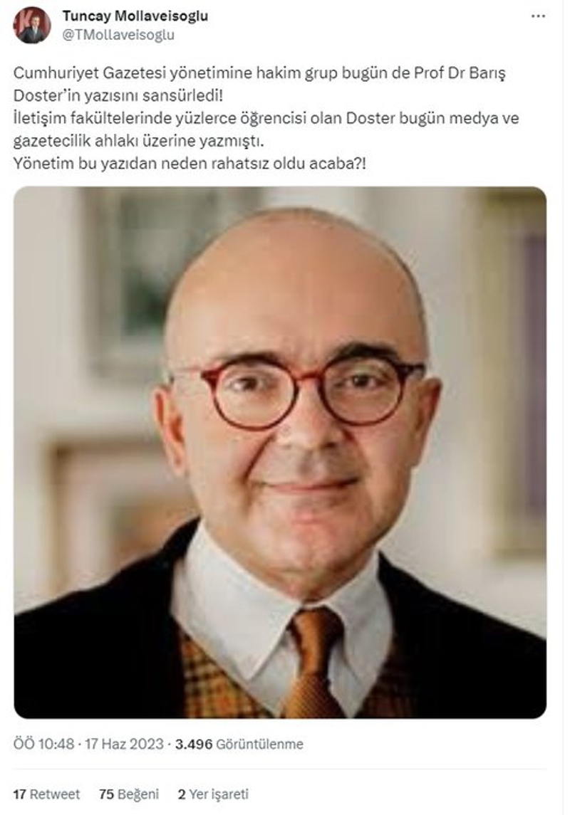 Tuncay Mollavesioğlu, Cumhuriyet Gazetesi'nin Cumhuriyet Vakfı Yönetim Kurulu Üyesi Prof. Dr. Barış Doster'in yazısını yayınlamadığı iddia etti. Durumu sosyal medyadan paylaşan Tuncay Mollavesioğlu, "Cumhuriyet Gazetesi yönetimine hakim grup bugün de Prof. Dr. Barış Doster'in yazısını sansürledi! İletişim fakültelerinde yüzlerce öğrencisi olan Doster bugün medya ve gazetecilik ahlakı üzerine yazmıştı. Yönetim bu yazıdan neden rahatsız oldu acaba?!" ifadelerine yer verdi.