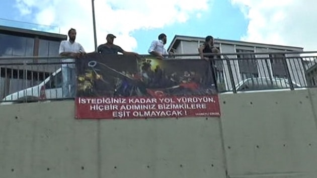 CHP Genel Başkanı Kemal Kılıçdaroğlu, bu sabah basın açıklamasının ardından "Adalet Yürüyüşü"ne Tuzla'dan devam etti. Yürüyüş sırasında Kılıçdaroğlu'na partililer de eşlik etti. Tuzla'da bir grup vatandaş 15 Temmuz hain darbe girişiminin hatırlatıldığı pankart açarak Kılıçdaroğlu'na tepki gösterdi. 15 Temmuz darbe girişimi sırasında tank üzerine çıkmış vatandaşların fotoğrafının olduğu pankartta, "İstediğiniz kadar yol yürüyün, hiçbir adımınız bizimkilere eşit olmayacak" yazdığı görüldü. Pankarta bazı vatandaşlar tepki gösterirken, CHP Genel Başkanı Kılıçdaroğlu'nun o yöne bakmadığı görüldü. CHP Lideri Kılıçdaroğlu'na oyuncu İlyas Salman eşlik ediyor.