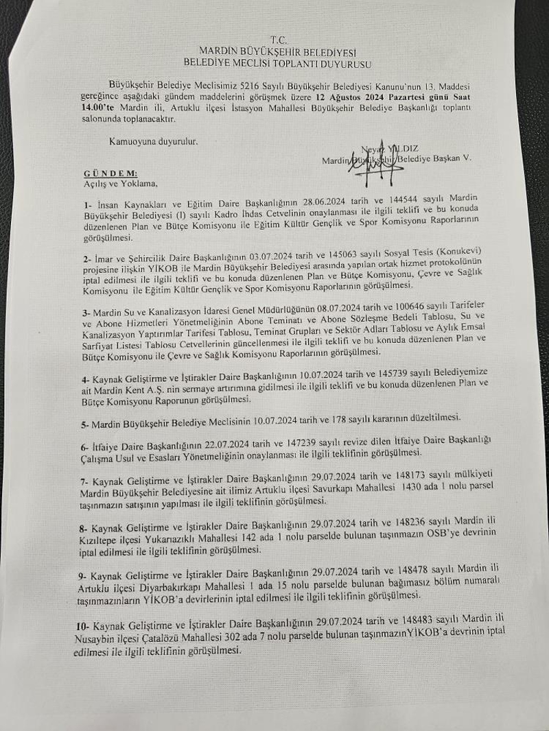 Mardin Büyükşehir Belediyesi, Artuklu Üniversitesi ve OSB iş birliğinde Mardin'de açılması planlanan Gıda Teknolojisi, Giyim Üretim Teknolojisi ve Tekstil Teknolojisi programlarının yer alacağı okul binaları arsasının OSB'ye devrinin iptalini, Ağustos ayı meclis gündemine getirdi. Kararın Mardin Büyükşehir Belediyesi meclisinden geçmesi halinde, Mardin'de sanayi ve istihdam alanında yapılacak üniversite bölümlerinin iptal edilmesi tehlikesiyle karşı karşıya kalacak.