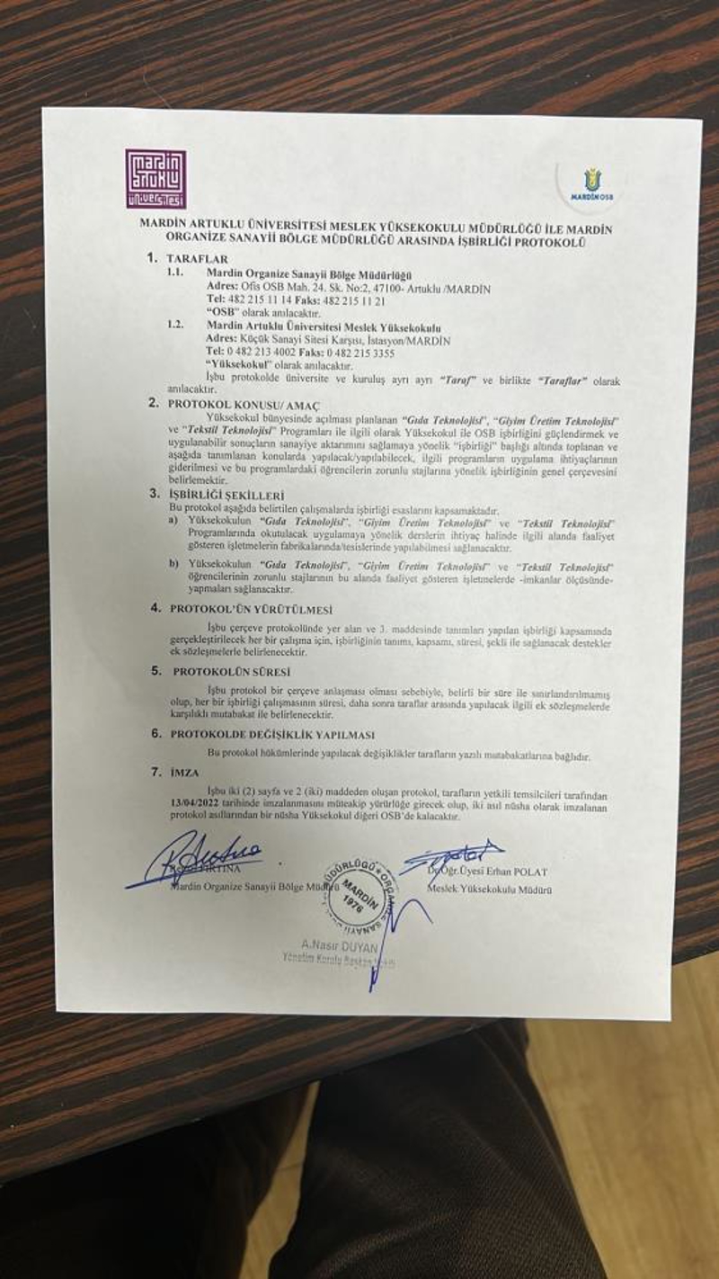 2022 yılında Mardin Valisi ve Büyükşehir Belediye Başkan Vekili Mahmut Demirtaş, Mardin Artuklu Üniversitesi Rektörü Prof. Dr. İbrahim Özcoşar, OSB Başkan Vekili Nasır Duyan, Mardin, Kızıltepe ve Nusaybin Ticaret Odaları ve Borsa Başkanları imzasıyla Mardin OSB'de Artuklu Üniversitesi bünyesinde Gıda Teknolojisi, Giyim Üretim Teknolojisi ve Tekstil Teknolojisi gibi bölümlerin açılması için 15 bin metrekarelik arsa OSB'ye devredildi. Mardin Büyükşehir Belediyesi, Artuklu Üniversitesi ve OSB tarafından yapılan protokolde, Artuklu Üniversitesi, Üniversite-Sanayi İş Birliğinin güçlendirilmesi ve imalatçılar ile sanayicilerin nitelikli ara eleman yetiştirilmesi projesi kapsamında Mardin Organize Sanayi Bölgesi içerisinde bulunan ve mülkiyeti Mardin Büyükşehir Belediyesine ait olan 15 bin 294,57 metrekarelik alanı Mardin OSB Müdürlüğüne devretti.