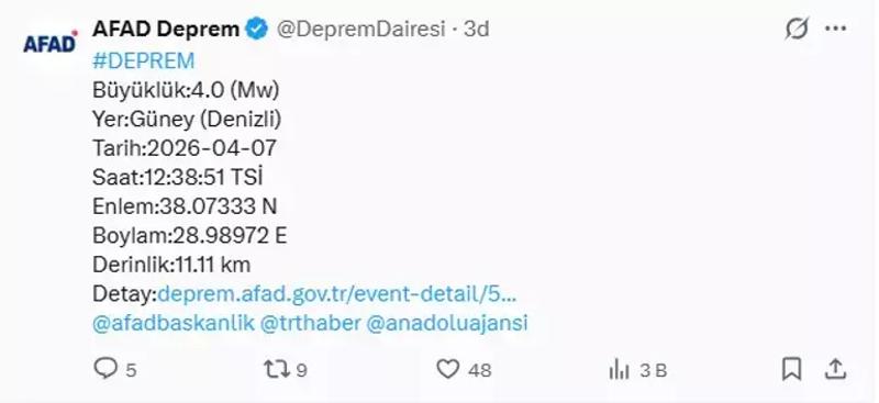 Afet ve Acil Durum Yönetimi Başkanlığının (AFAD) internet sitesinde yer alan bilgiye göre, merkez üssü Güney ilçesi olan 4 büyüklüğünde sarsıntı kaydedildi.Depremin 11.11 kilometre derinlikte meydana geldiği belirlendi.