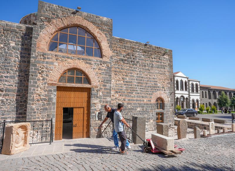 "Müdürlüğümüze gelen bir telefon ihbarıyla Hani ilçemize gittik. İlçede 6 Şubat Kahramanmaraş merkezli depremlerde zarar gören bazı evlere yönelik yıkım çalışması yapıldığını gördük. Yıkım ve kazı esnasında bir tarihi esere rastlanılmış. İnşaat sahasında yaptığımız araştırmada bir mezar kapağı olduğunu gözlemledik. Yerinden alıp İçkale'ye getirdik. Mermerden olan mezar kapağını 10 Ağustos'ta açılışını yaptığımız Saint George Kilisesi önünde sergilemek için hazırlık yaptık."