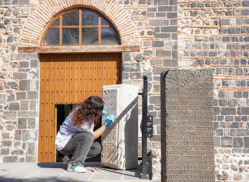 Müze bahçesindeki 1800 yıllık Saint George Kilisesi önüne bırakılan mezar kapağı, arkeolog, restoratör, antropolog ve sanat tarihçilerinden oluşan ekip tarafından ince bir çalışmayla temizlenecek ve incelenecek.