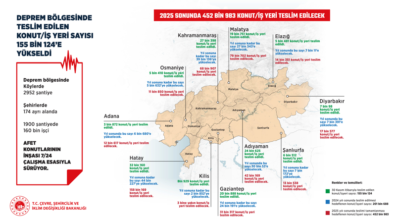 2025 yılı sonunda tüm deprem konutlarının tamamlanması hedefleniyor. 2025 sonunda Adana'da 12 bin 528 konut ve 89 iş yeri, Adıyaman'da 39 bin 772 konut ve 2 bin 397 iş yeri, Diyarbakır'da 17 bin 326 konut ve 251 iş yeri, Elazığ'da 14 bin 264 konut ve 87 iş yeri, Gaziantep'te 29 bin 940 konut ve bin 377 iş yeri, Hatay'da 146 bin 305 konut ve 11 bin 864 iş yeri, Kahramanmaraş'ta 62 bin 775 konut ve 6 bin 132 iş yeri, Kilis'te 3 bine yakın konut ve iş yeri, Malatya'da 66 bin 941 konut ve 12 bin 761 iş yeri, Osmaniye'de 10 bin 884 konut ve 966 iş yeri, Şanlıurfa'da 13 bin 443 konut ve 95 iş yerinin teslim edilmesi hedefleniyor.