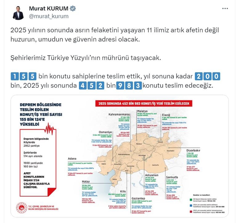 Çevre, Şehircilik ve İklim Değişikliği Bakanı Murat Kurum, sosyal medya hesabından deprem bölgesindeki 11 ilde konutların teslimatına ilişkin son rakamları paylaştı. Bakan Kurum, "2025 yılının sonunda asrın felaketini yaşayan 11 ilimiz artık afetin değil huzurun, umudun ve güvenin adresi olacak. Şehirlerimiz Türkiye Yüzyılı'nın mührünü taşıyacak. 155 bin konutu sahiplerine teslim ettik, yıl sonuna kadar 200 bin, 2025 yılı sonunda 452 bin 983 konutu teslim edeceğiz" ifadesini kullandı.