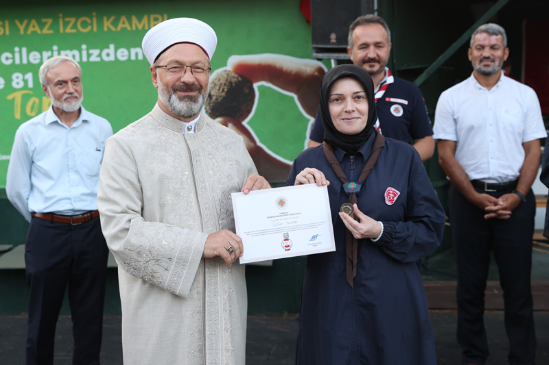 Başkan Erbaş, konuşmasının ardından, 6 Şubat 2023 Kahramanmaraş merkezli depremlerinden sonra başlatılan arama kurtarma ve insani yardım faaliyetlerine katkı sağlayan 14 izci liderine "Türkiye İzcilik Federasyonu Başkanlığı Cesaret ve Feragat Nişanı"nı takdim etti.