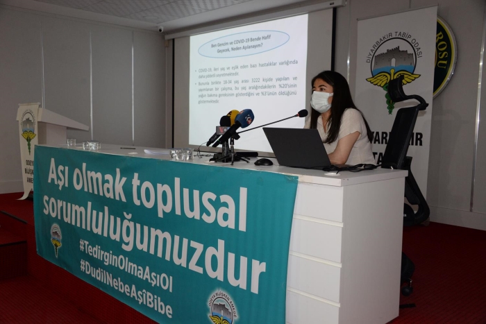 Toplantıda konuşan Dr. Elif Turan, Diyarbakır'ın vaka artışında pikte, aşılama oranında da dipte olduğunu söyledi. Aşı olmayı toplumsal sorumluluk bilinci gördükleri için Diyarbakır Tabip Odası olarak aşı kampanyası başlattıklarını söyleyen Turan, şöyle konuştu: