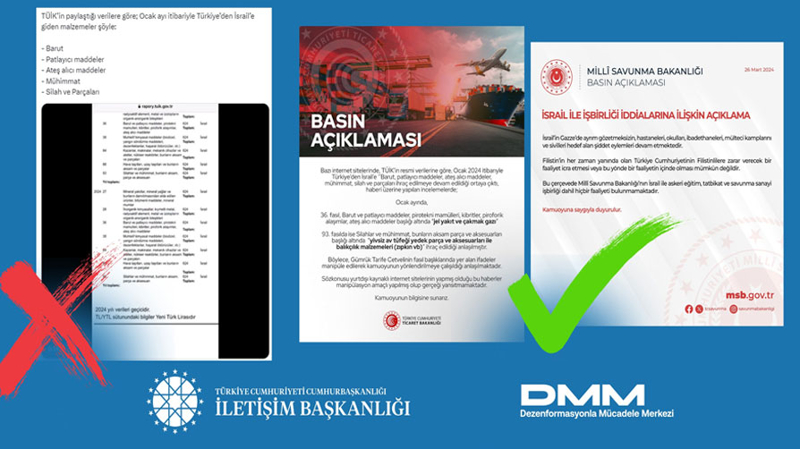 Dezenformasyonla Mücadele Merkezi'nden yapılan açıklamada, "Bazı basın yayın organlarında yer alan, 'Türkiye'den İsrail'e barut, silah ve mühimmat ihracatı devam ediyor' iddiası doğru değildir. Her zaman Filistin'in haklı davasının yanında yer alan Türkiye Cumhuriyeti'nin, Filistinlilere zarar verecek herhangi bir faaliyet içinde bulunması mümkün değildir. Türkiye Cumhuriyeti Devleti, İsrail ile askeri mühimmat ticareti, askeri eğitim ve tatbikat da dahil hiçbir faaliyette bulunmamaktadır" denildi.