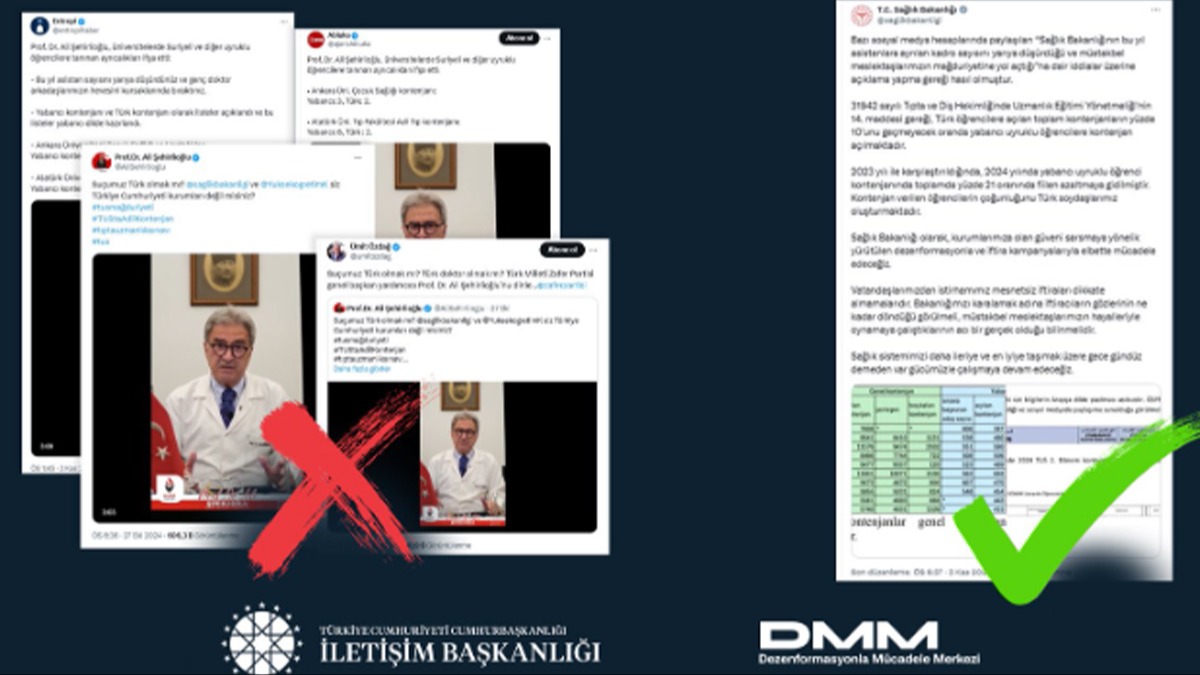 İletişim Başkanlığı Dezenformasyonla Mücadele Merkezi (DMM) tarafından yapılan açıklamada, "31942 sayılı Tıpta ve Diş Hekimliğinde Uzmanlık Eğitimi Yönetmeliğinin 14. maddesi gereği Türk öğrencilerine açılan kontenjanların yüzde 10'unu geçmeyecek şekilde yabancı uyruklu öğrencilere kontenjan açılmaktadır" denildi.