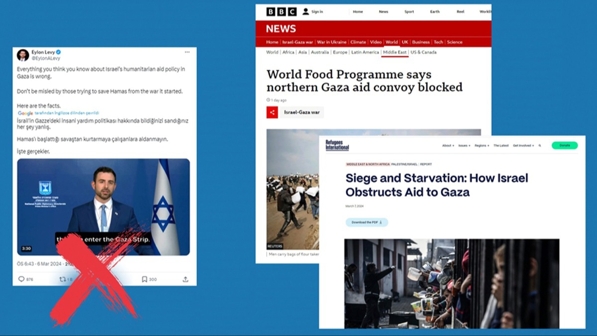 İsrail Hükümet Sözcüsü Eylon Levy tarafından dile getirilen, "Gazze Şeridi'ne girecek insani yardımlar İsrail tarafından engellenmiyor." iddiası doğru değildir.
