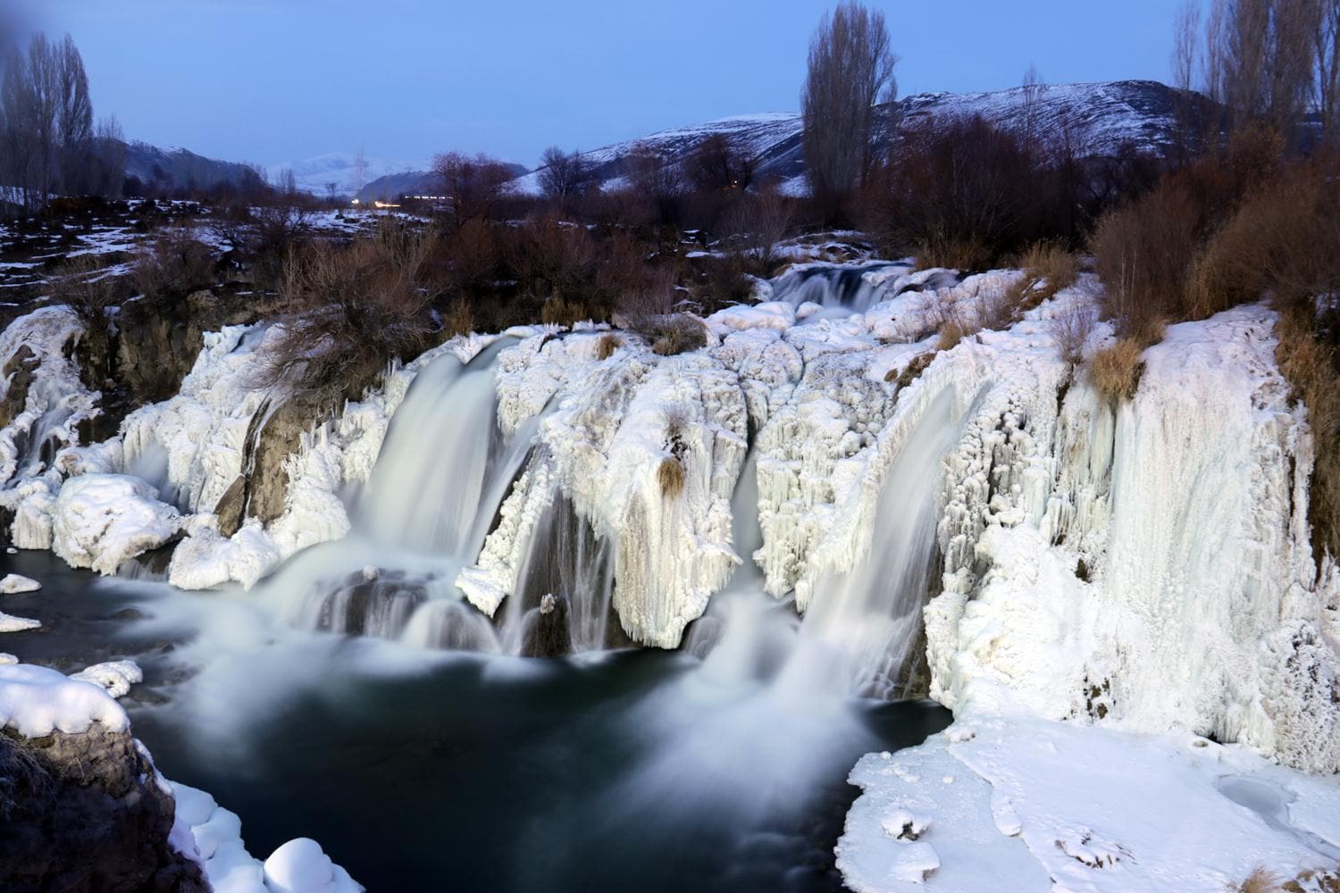 Yılın her döneminde farklı güzelliklere bürünerek ziyaretçilerin ilgisini çeken Muradiye Şelalesi, kış aylarında Pamukkale'deki travertenleri andıran görüntüsüyle hayran bırakıyor.