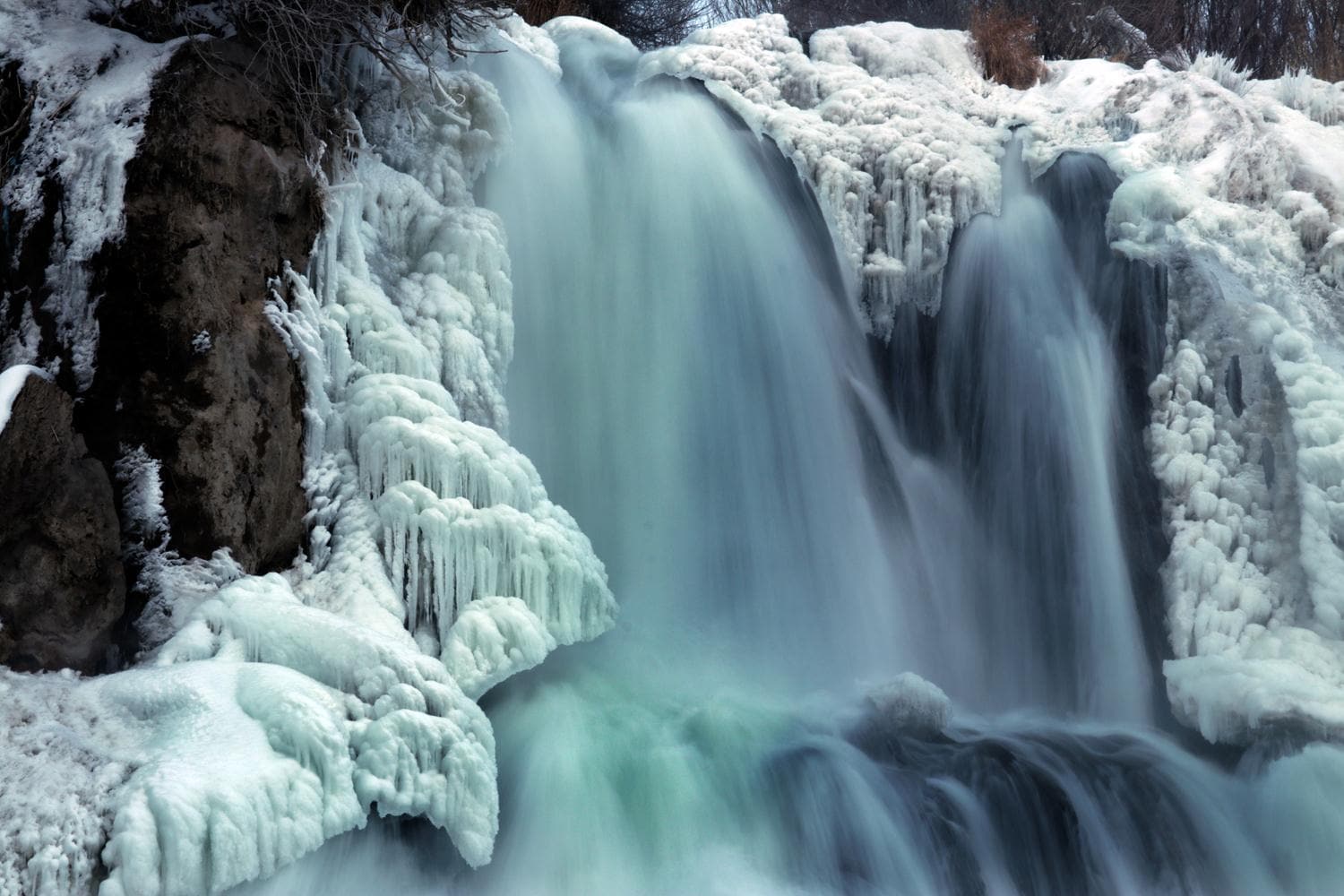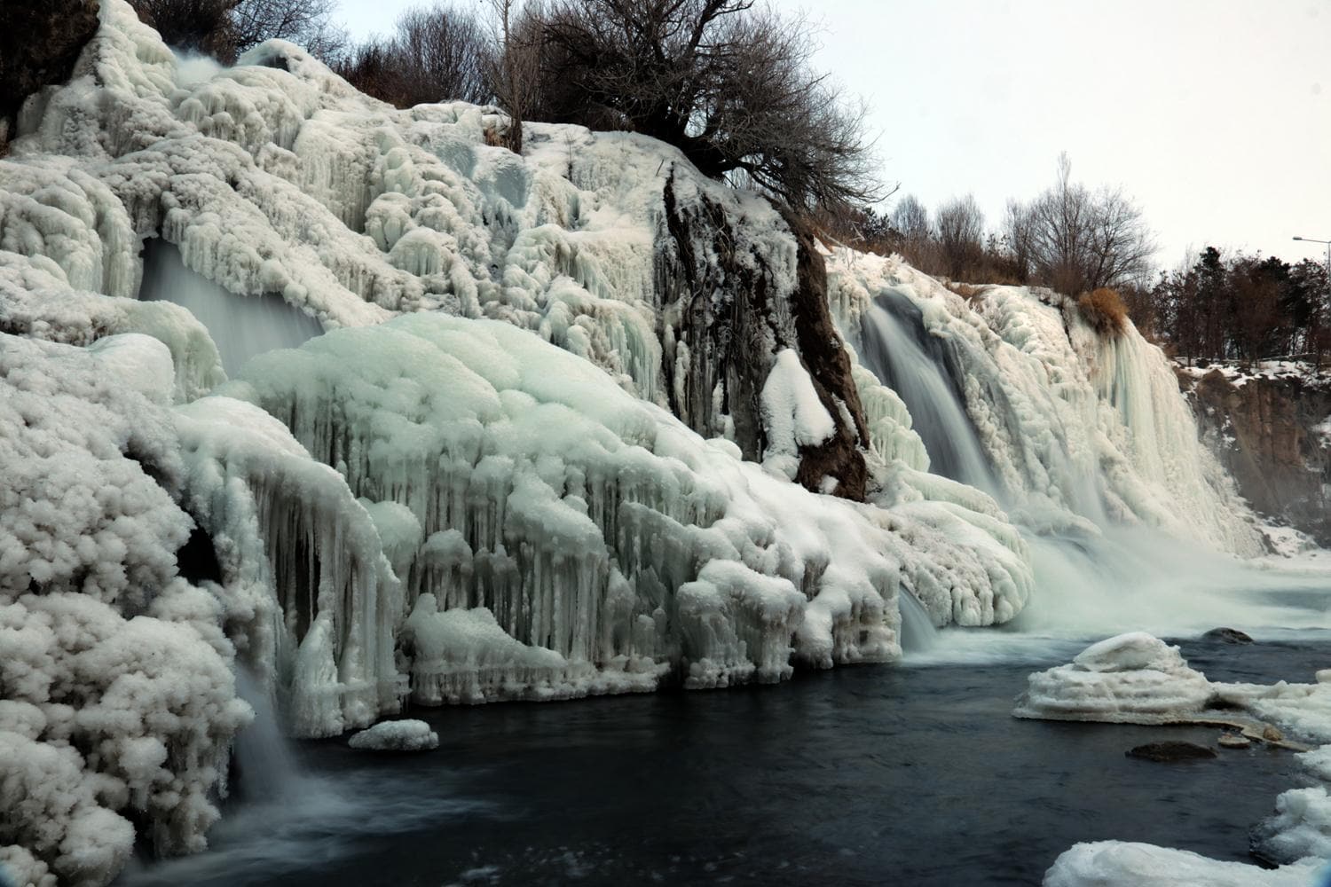 Yaklaşık 15 metre yükseklikten düşen şelalenin buzla kaplı görüntüsü ve soğuk hava nedeniyle ağaç dallarında oluşan kırağı, doyumsuz manzaralar oluşturdu.