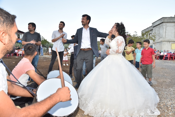Evlerinin önünde düzenlenen program öncesinde kuaföre götürülerek saçı ve makyajı yapılan Emine, daha sonra gelinliğini giydi. Gelin arabası olarak süslenen otomobille düğünün gerçekleştirileceği alana gelen Öztür, burada akrabaları ve arkadaşları tarafından coşkuyla karşılandı, alkışlarla araçtan indi.
