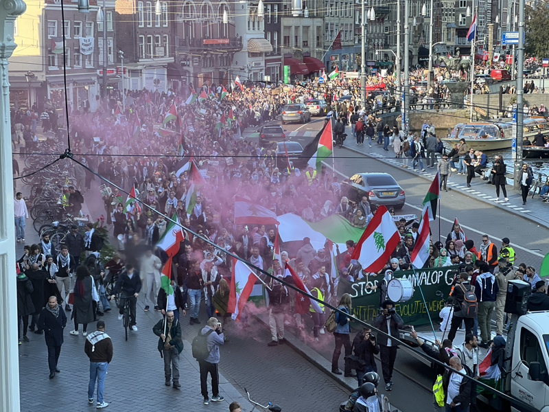Filistin bayraklarının taşındığı gösteride, "Özgür Filistin", "Özgür Lübnan", "Yazıklar olsun Hollanda, Yazıklar olsun Wilders, elleriniz kanlı" ve "İsrail bombalıyor, Hollanda ödüyor" sloganları atıldı.
