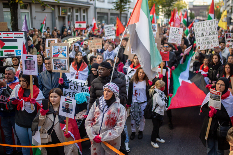 Almanya'nın Düsseldorf kentinde, İsrail'in Gazze'ye yönelik saldırılarının birinci yılı dolayısıyla protesto yürüyüşü düzenlendi.