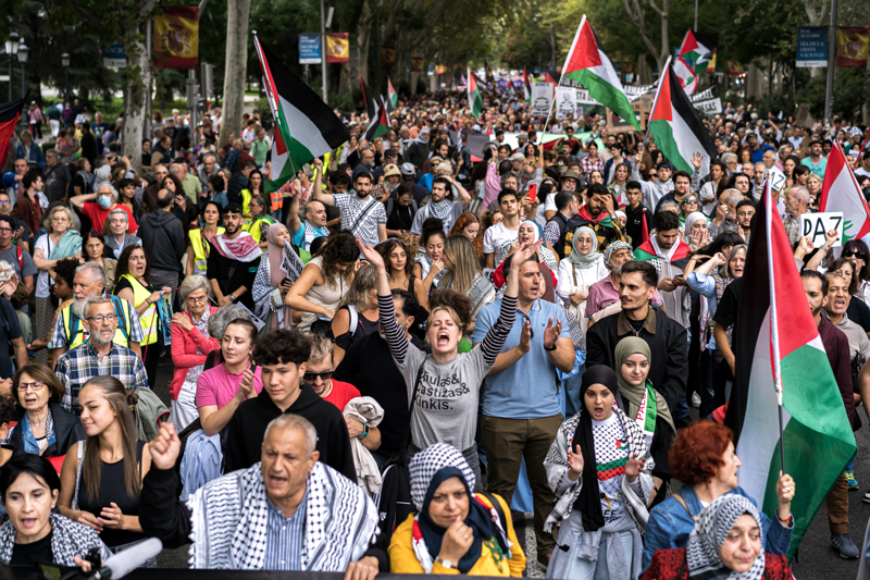 Başkent Madrid'de kent merkezinde yapılan ve Filistin bayraklarının taşındığı yürüyüşe, aralarında bazı sanatçılar ve siyasetçilerin de olduğu binlerce kişi katıldı.