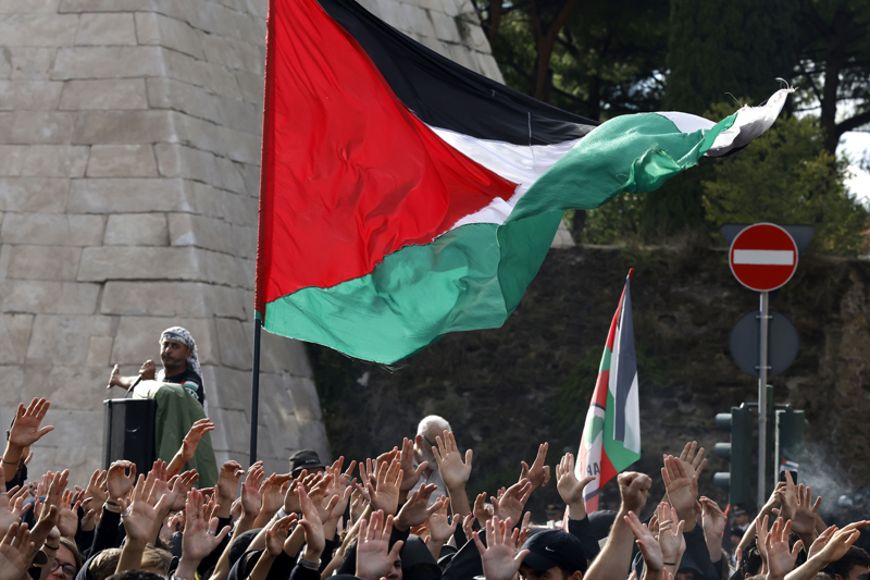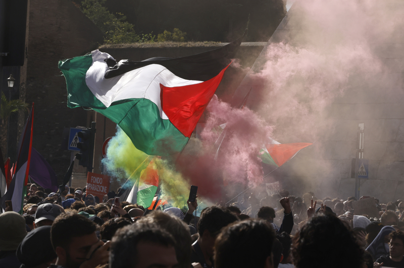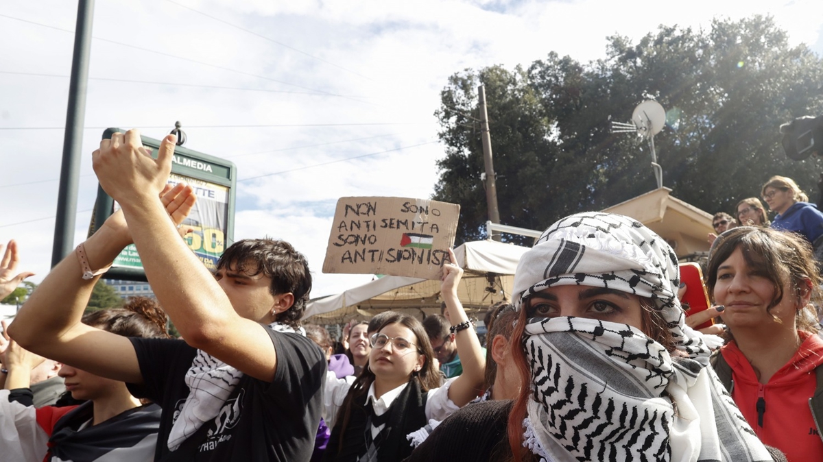 Roma Emniyet Müdürlüğünün 7 Ekim 2023'ün yıl dönümüne denk gelmesi sebebiyle bugün için koyduğu gösteri yasağına rağmen binlerce kişi, başkent Roma'daki Ostiense Meydanı'nda bir araya geldi.